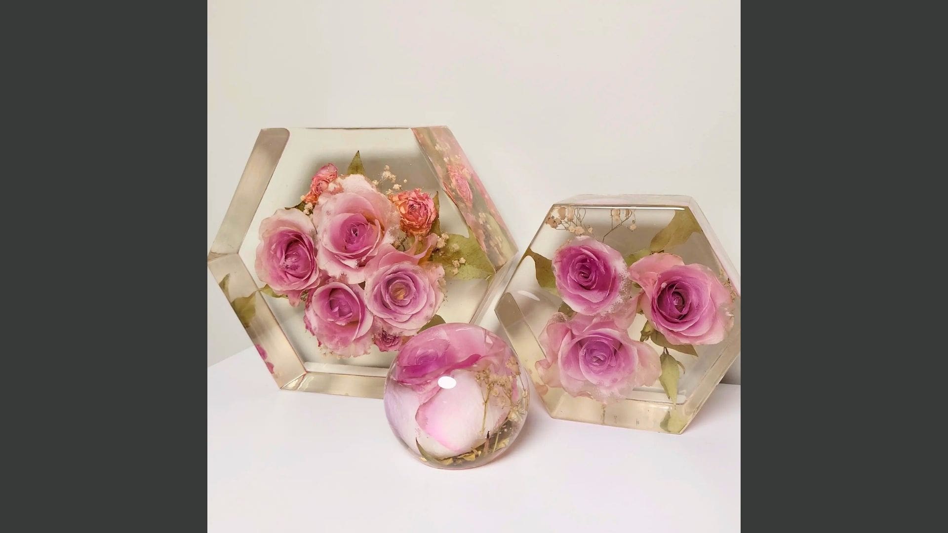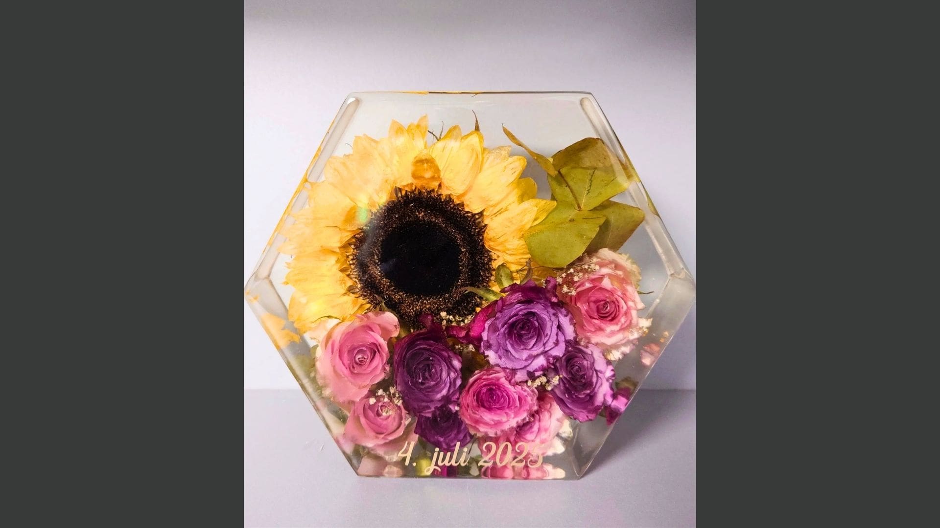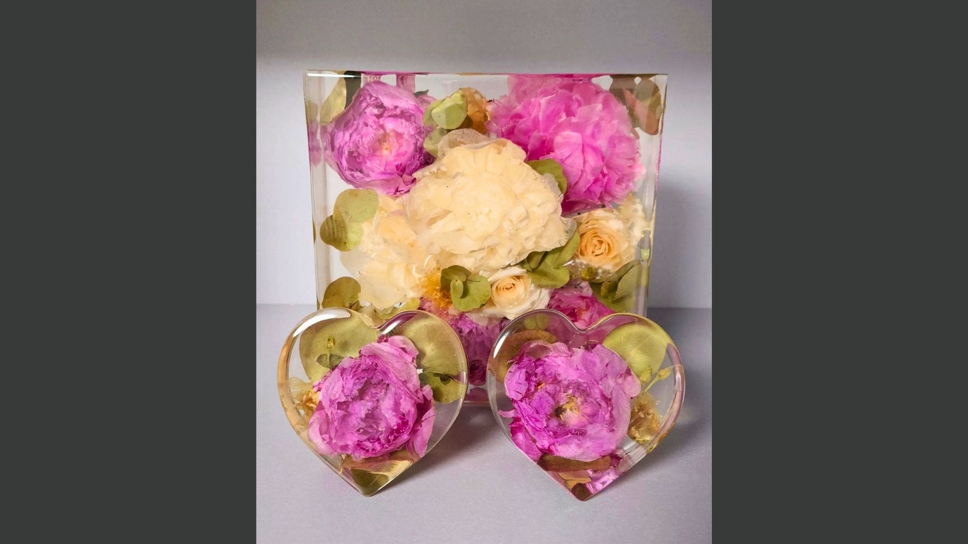 • Kunstobjekter med ekte bryllupsblomster støpt i epoxy